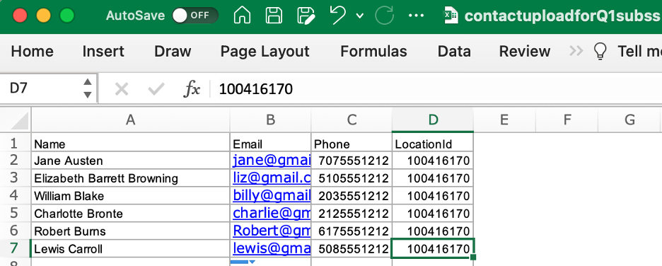- Import your contacts into the sheet. Add only the necessary contact information. For example, you wouldn't need phone numbers for an email campaign. When you’re done adding contacts, save the file as a CSV or Excel.